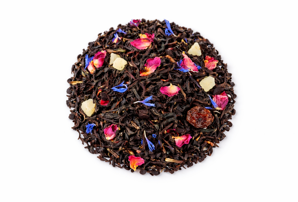 Купаж на основе черного чая с грушей , лепестками розы и насыщенным ароматом граната